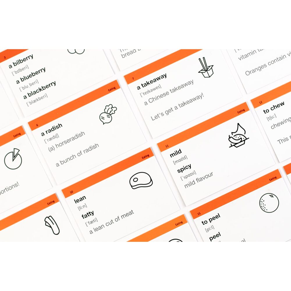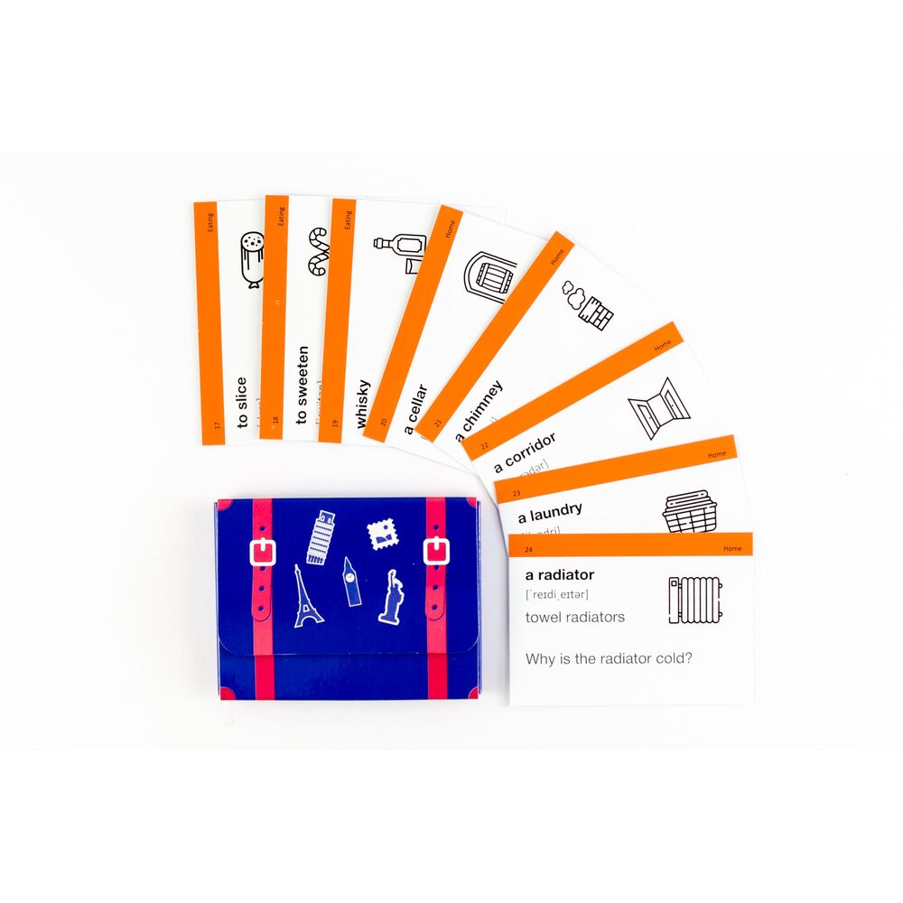Кожен набір містить: 500 карток, коробку для інтервального повторення, дорожній футляр, QR-код з аудіосупроводо та збірку ігор.