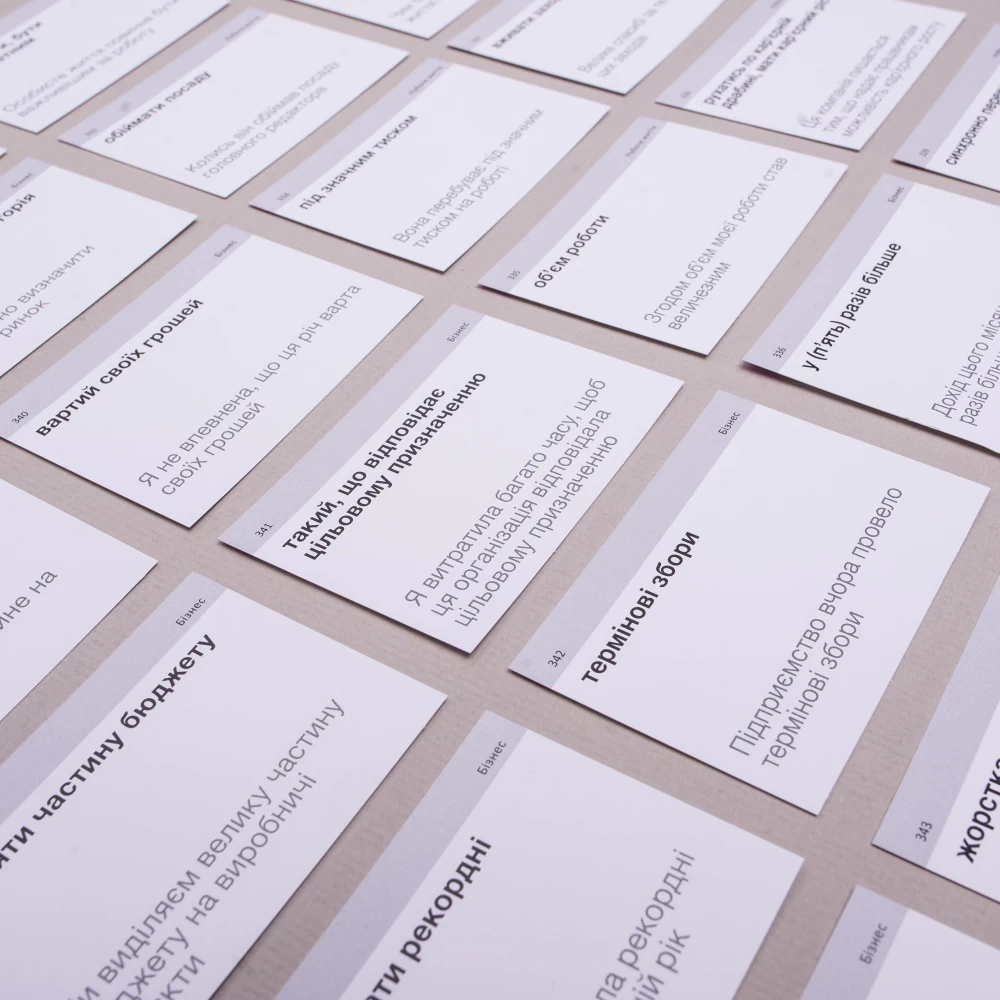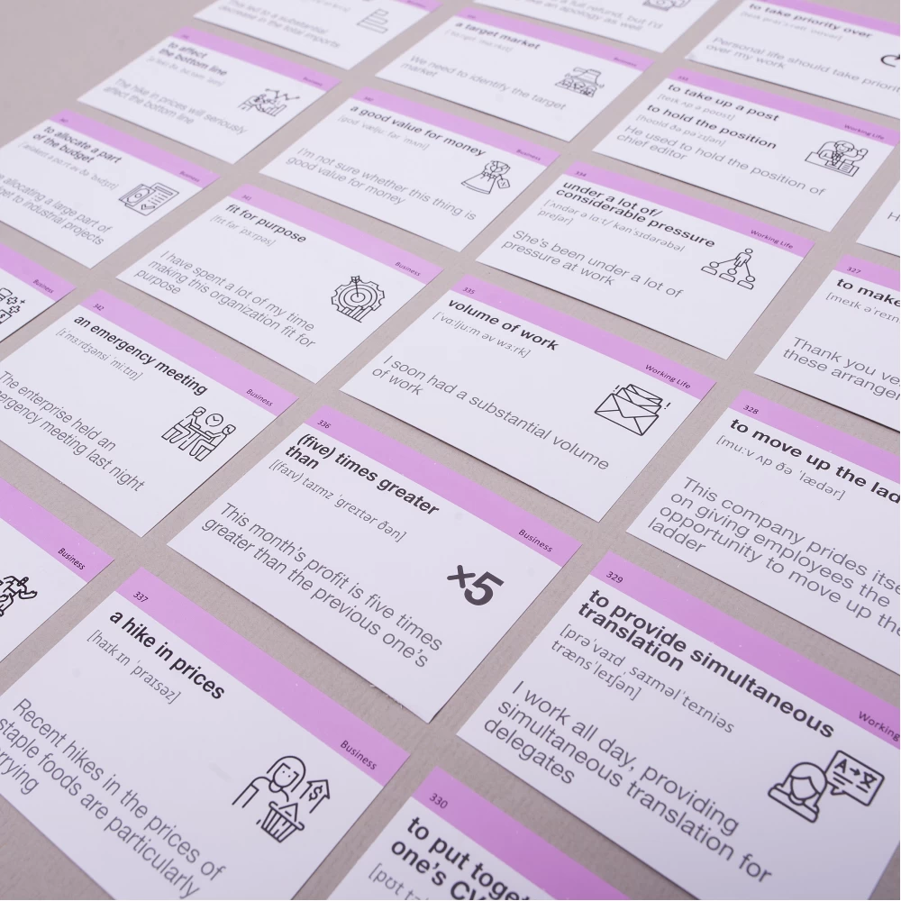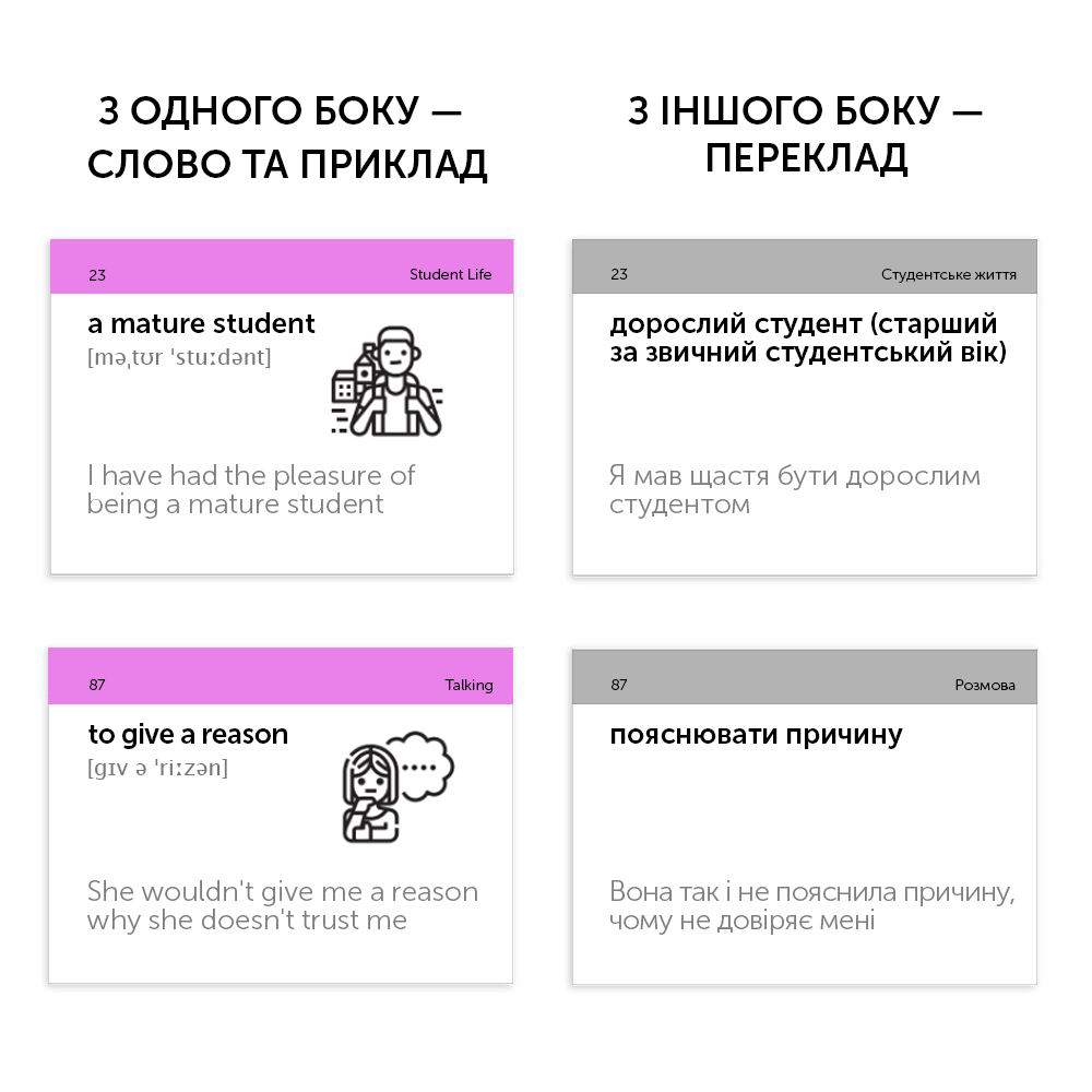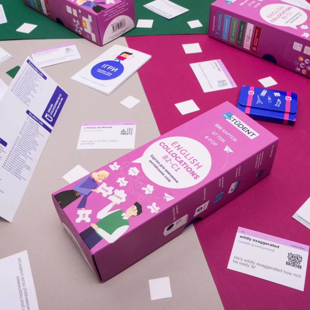 Кожен набір містить: 500 карток, коробку для інтервального повторення, дорожній футляр, QR-код з аудіосупроводом та збірку ігор.