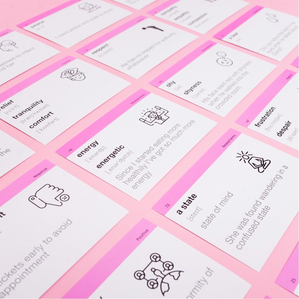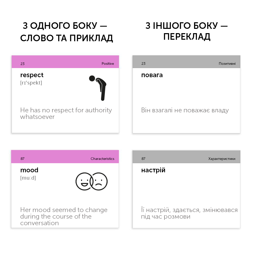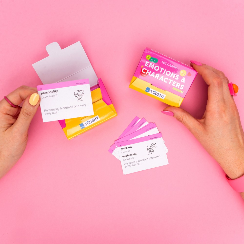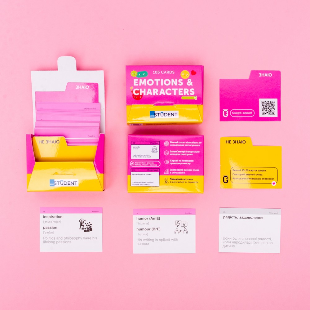 Набір «Emotions & Characters» (рівень А1-B1) — набір з дууууже емоційною лексикою. На картках ми зібрали слова, що описують емоції, стани та характеристики. Ідеально підійде психологам та людям, які цікавлячться ментальним здоров'ям.