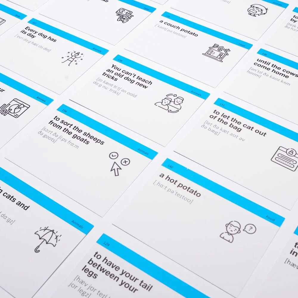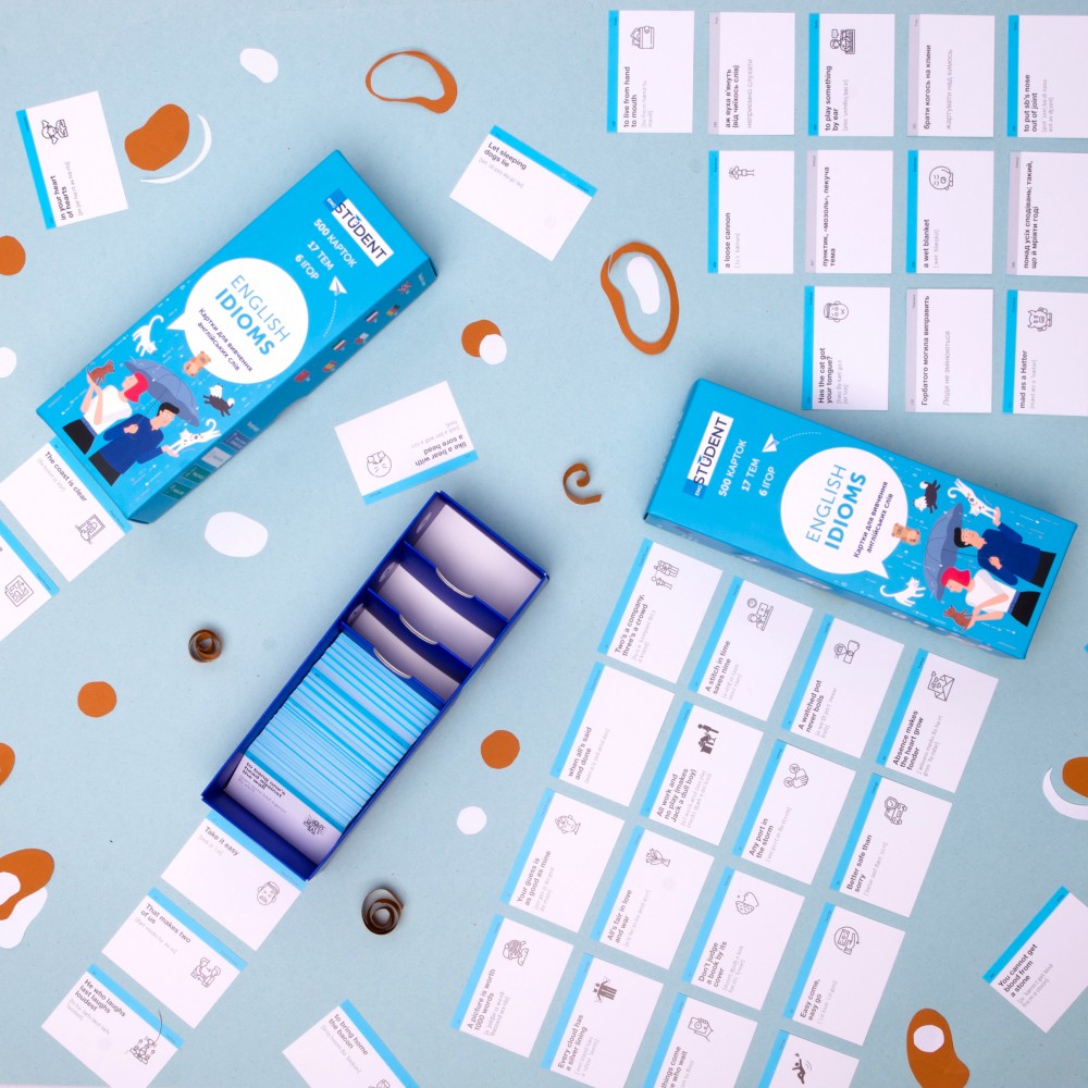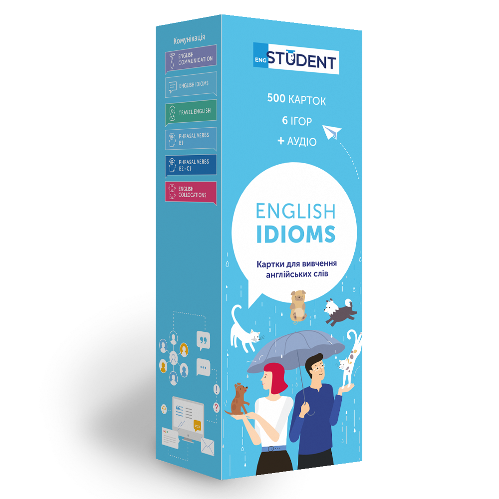 «English Idioms» (рівень В1-С1) — набір карток для вивчення англійських ідіом. Тут зібрані найбільш вживані ідіоми англійською та їхні відповідники українською. Відтепер тебе не збиватимуть із пантелику фрази на кшталт «to rain cats and dogs», «to sit on the fence» чи «like talking to a brick wall».  А твоя англійська стане по-справжньому perfect.