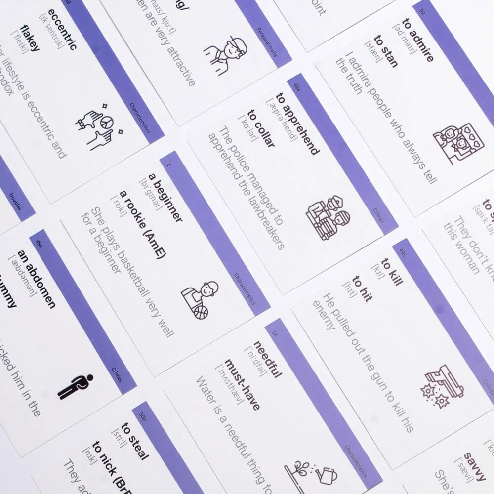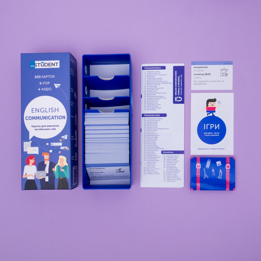 Кожен набір містить: 500 карток, коробку для інтервального повторення, дорожній футляр, збірку ігор, QR-код з аудіосупроводом
