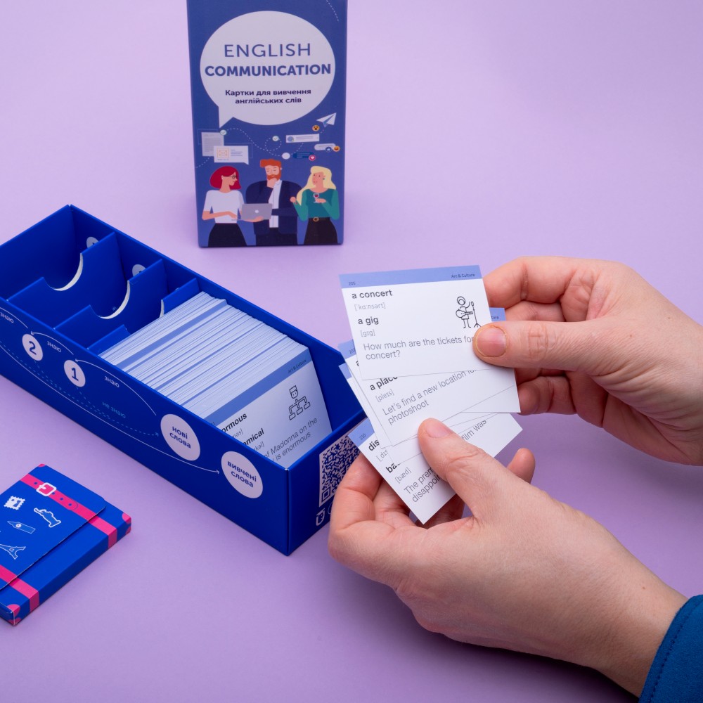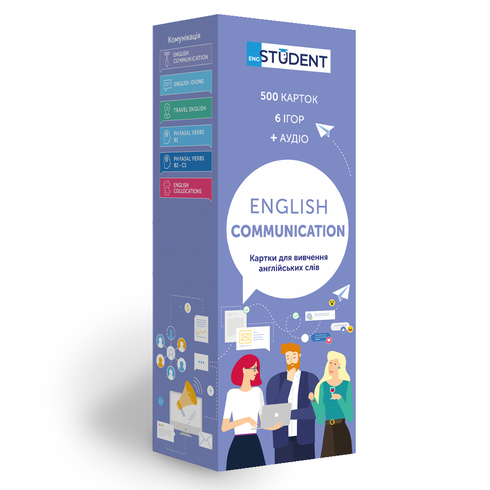 «English Communication» (рівень В1-С1) — набір карток для покращення комунікативних умінь. Тут ви знайдете слова та приклади, які варто вживати у діловому листуванні, у спілкуванні з бізнес-партнерами чи під час презентацій для іноземних клієнтів. До того ж у цьому наборі карток для вивчення англійських слів є лексика для щоденного спілкування з друзями чи колегами — загальновживані слова та сленг.