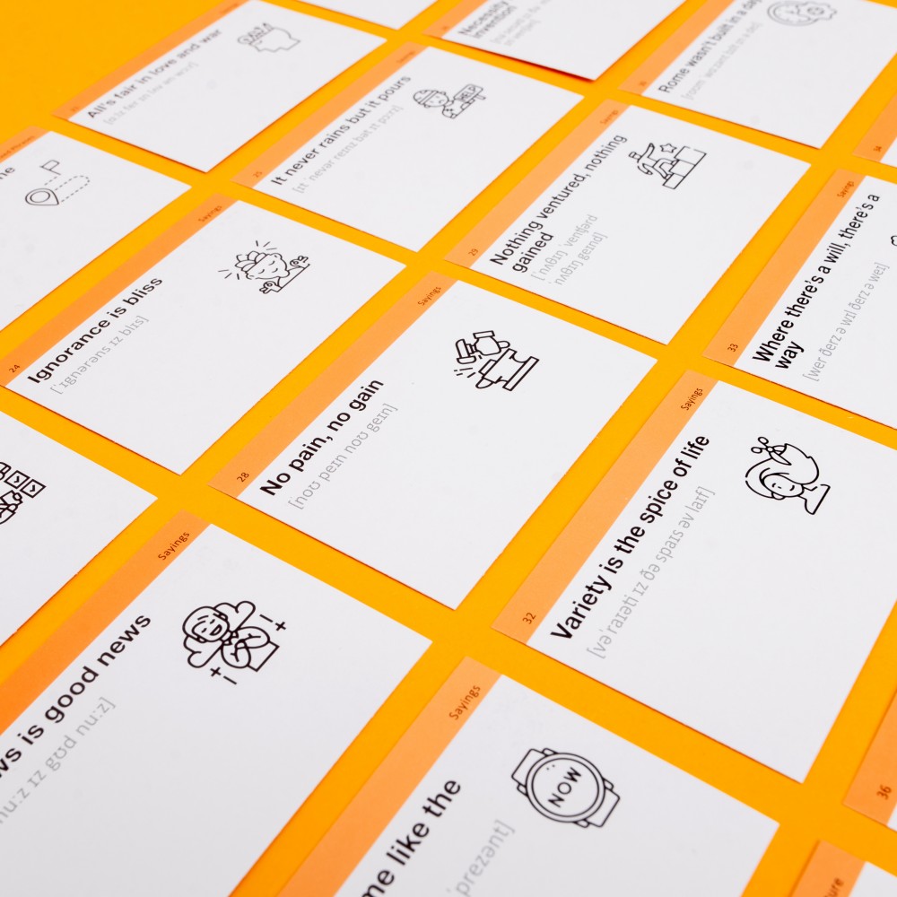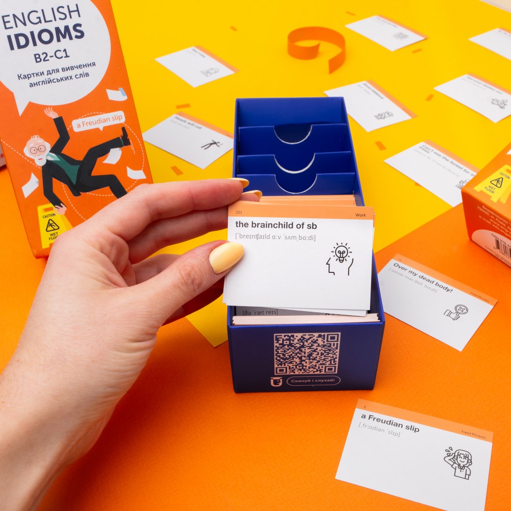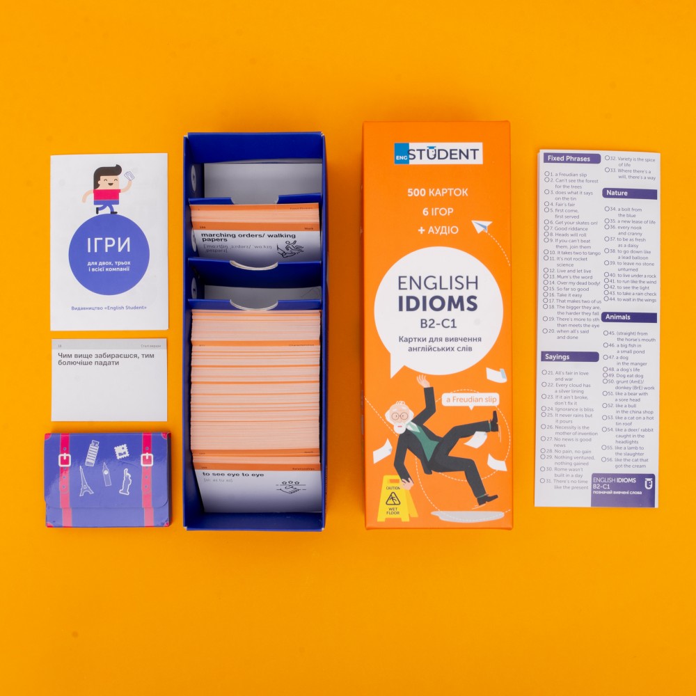 «English Idioms B2-C1» — набір карток для вивчення англійських ідіом вищого рівня складності. Тут зібрані складніші й цікавіші, та все одно популярні ідіоми, приказки, прислів'я й сталі вирази англійською та їхні відповідники українською. Обирають ті, хто хоче глибше зануритися у світ англійських ідіом та більше не збиватися з пантелику від виразів по типу «like talking to a brick wall».