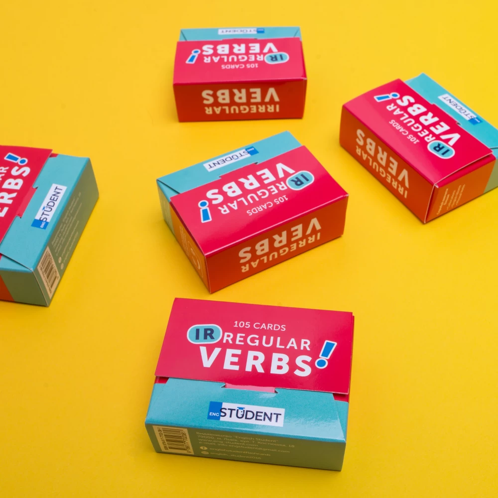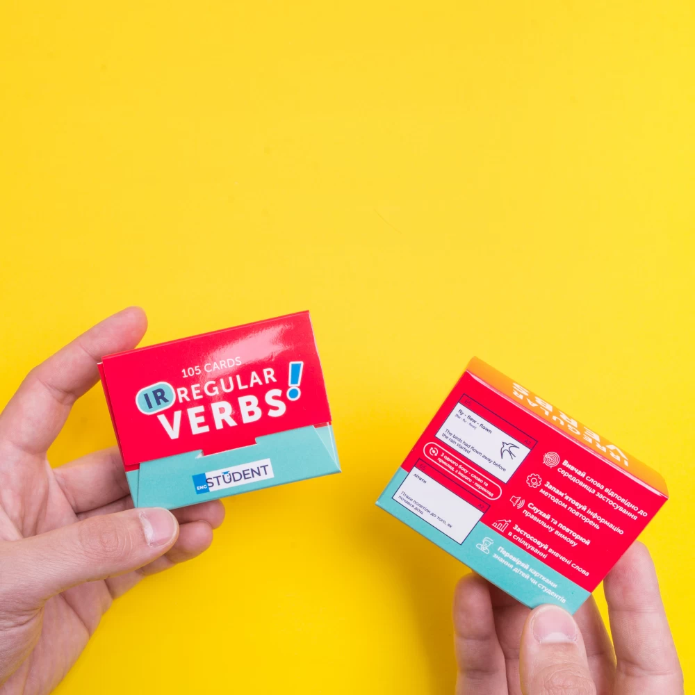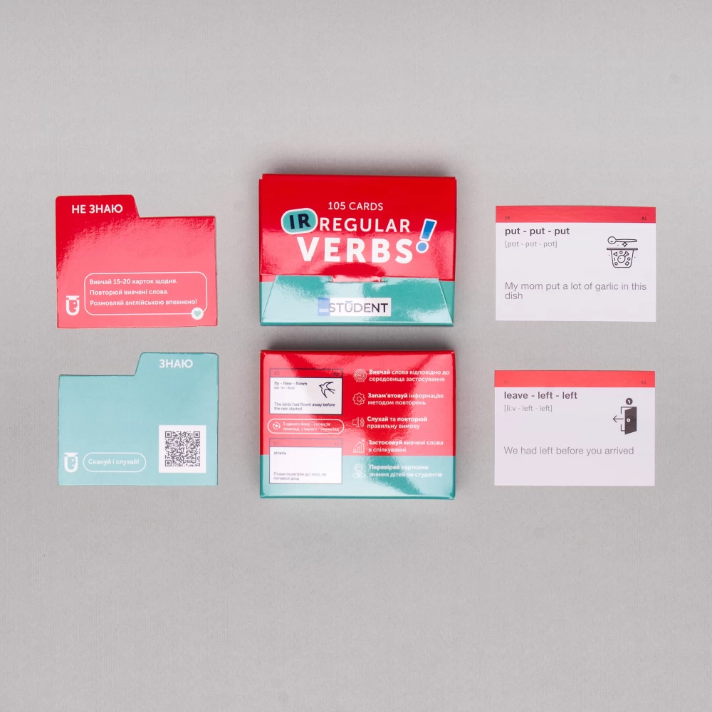 Набір «Irregular Verbs» (рівень А1-В2) — це добірка найвживаніших неправильних дієслів в англійській мові. Неправильні дієслова — це одна з основних граматичних тем, опанувати яку ну просто необхідно. Картки допоможуть правильно будувати речення в минулих часах, а додатковий звуковий супровід до кожної картки навчить правильно вимовляти дієслова. Усі слова в наборі поділені за рівнями (від А1 до В2), а всередині кожного рівня — за частотою вживання.
