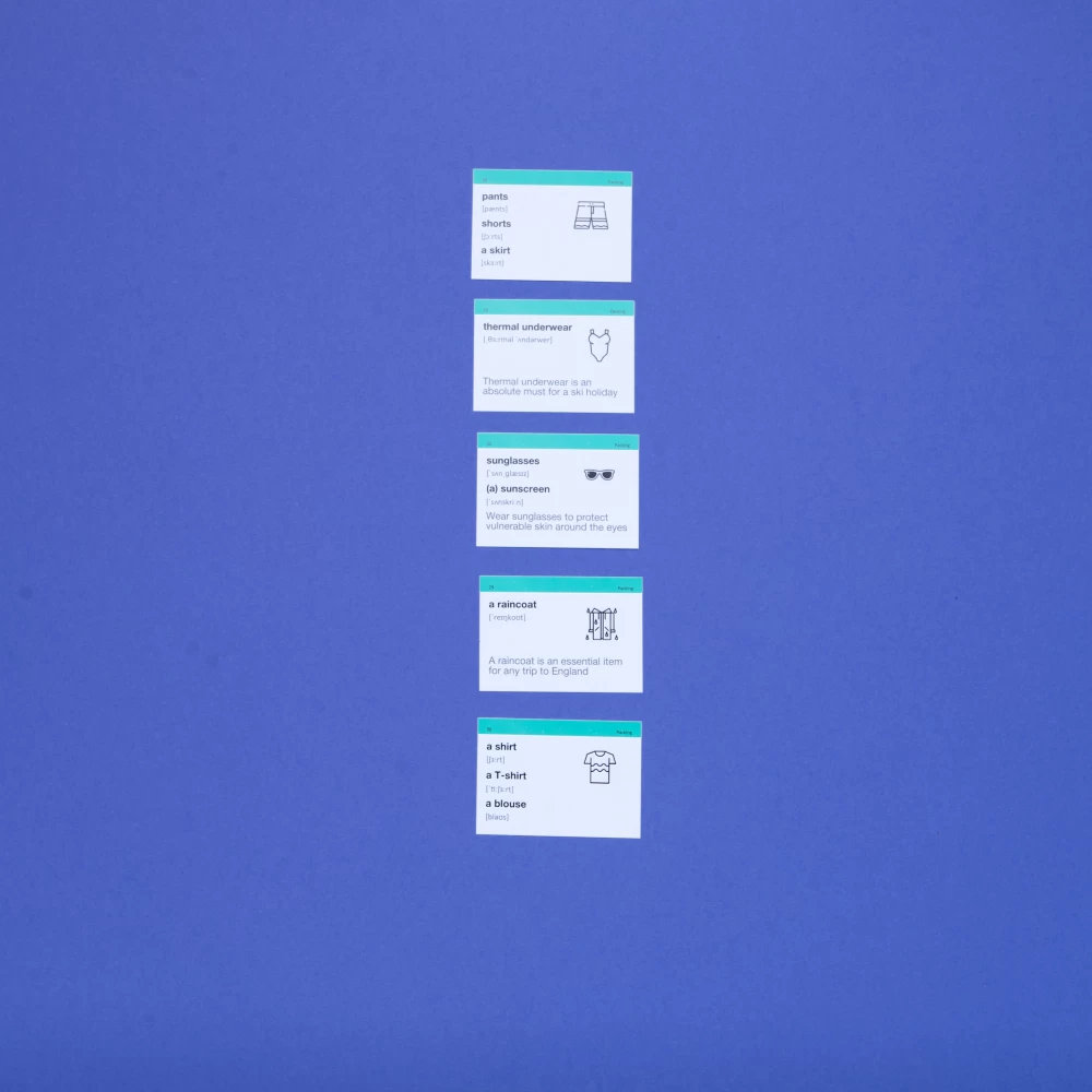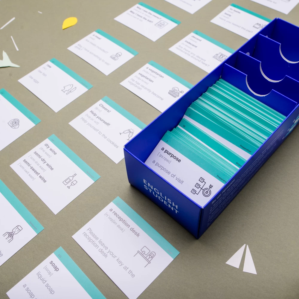Кожен набір містить: 500 карток, коробку для інтервального повторення, дорожній футляр, QR-код з аудіосупроводом та збірку ігор.