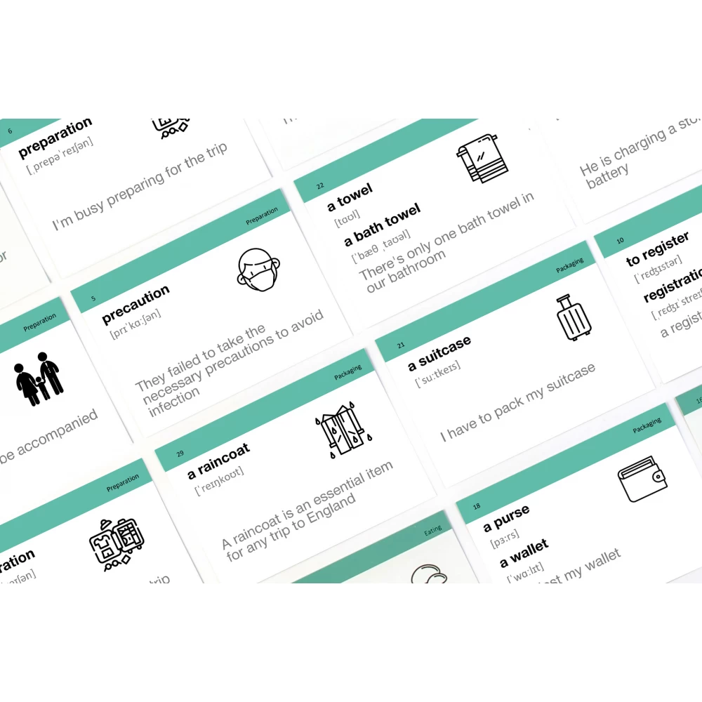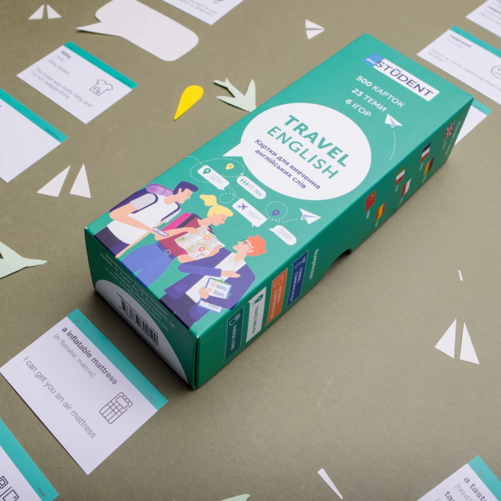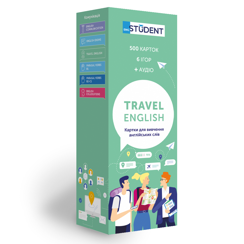 Travel English (рівень А2-В2) — англійська для тих, хто любить подорожувати. Хто не уявляє життя без дороги, обожнює відкривати нові країни та міста. А також для тих, хто вперше збирається за кордон. Тут ти знайдеш слова та вирази англійською, які допоможуть забронювати готель, зробити замовлення, купити квиток чи просто поспілкуватись з іноземцями. У цьому наборі 790 англійських слів та 601 приклад вживання.
