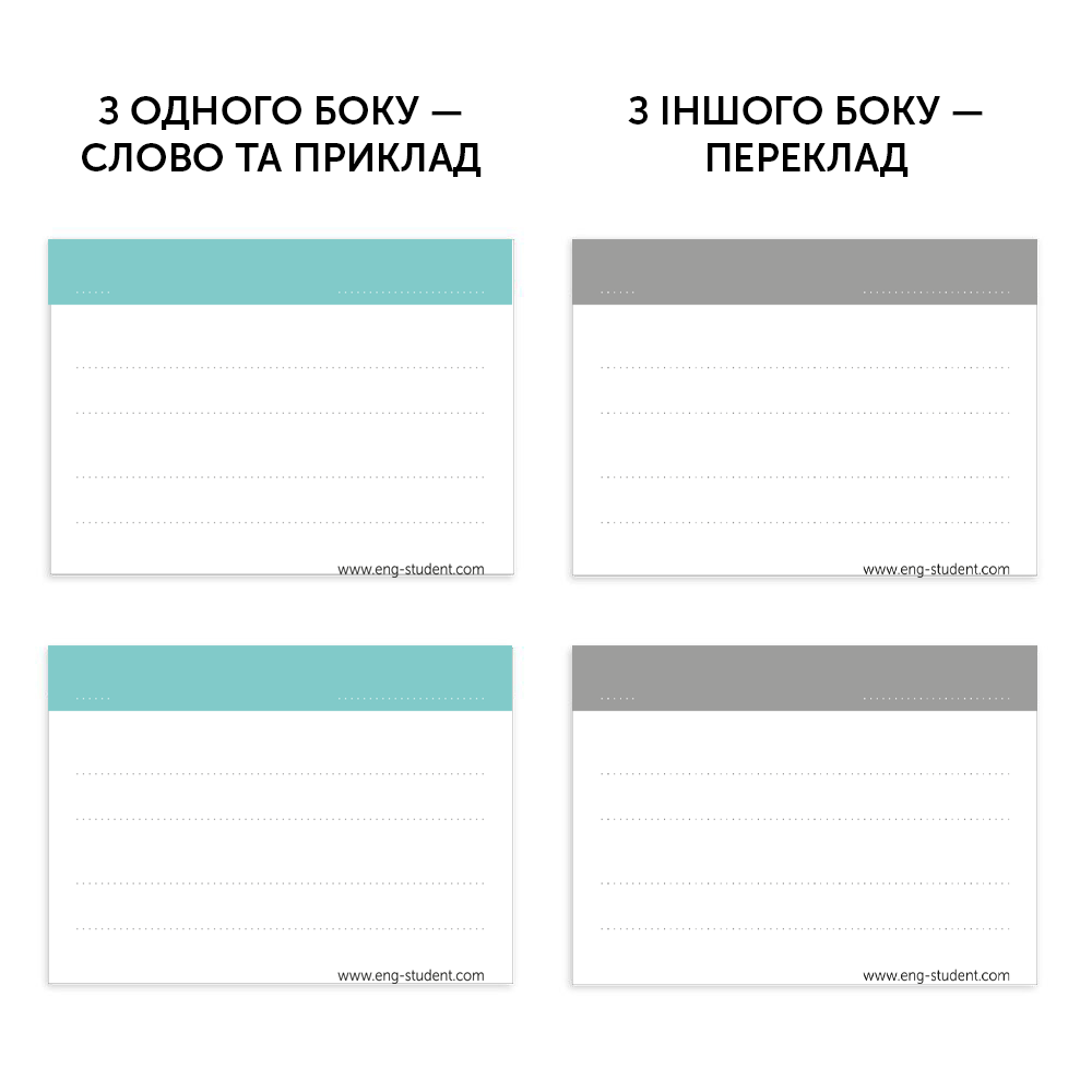Кожен набір містить: 105 незаповнених карток, два розділювачі «Знаю» та «Не знаю», спрощену версію коробки для інтервального повторення