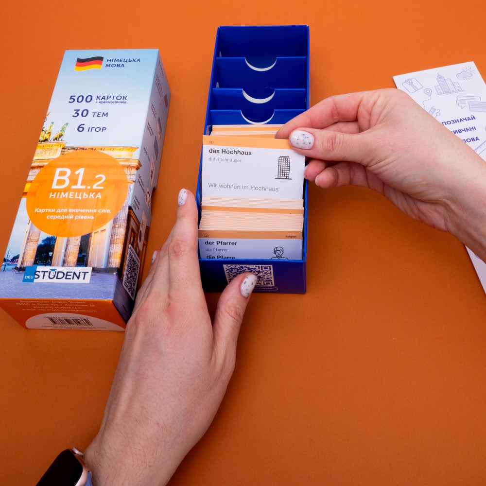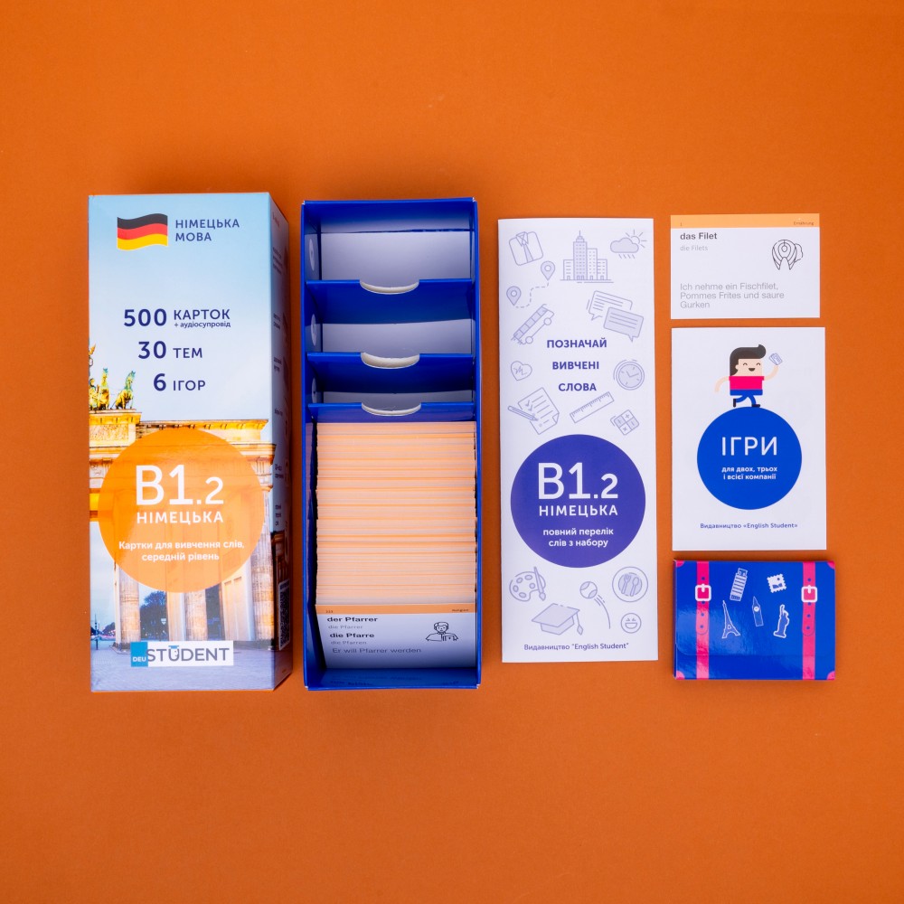 Набір німецька В1.2 — друга частина середнього рівня. Призначена для тих, хто вже опанував базові рівні та хоче почати розуміти інших, дивитись фільми й читати нескладні тексти німецькою. Картки цього рівня допоможуть опанувати базову розмовну лексику.