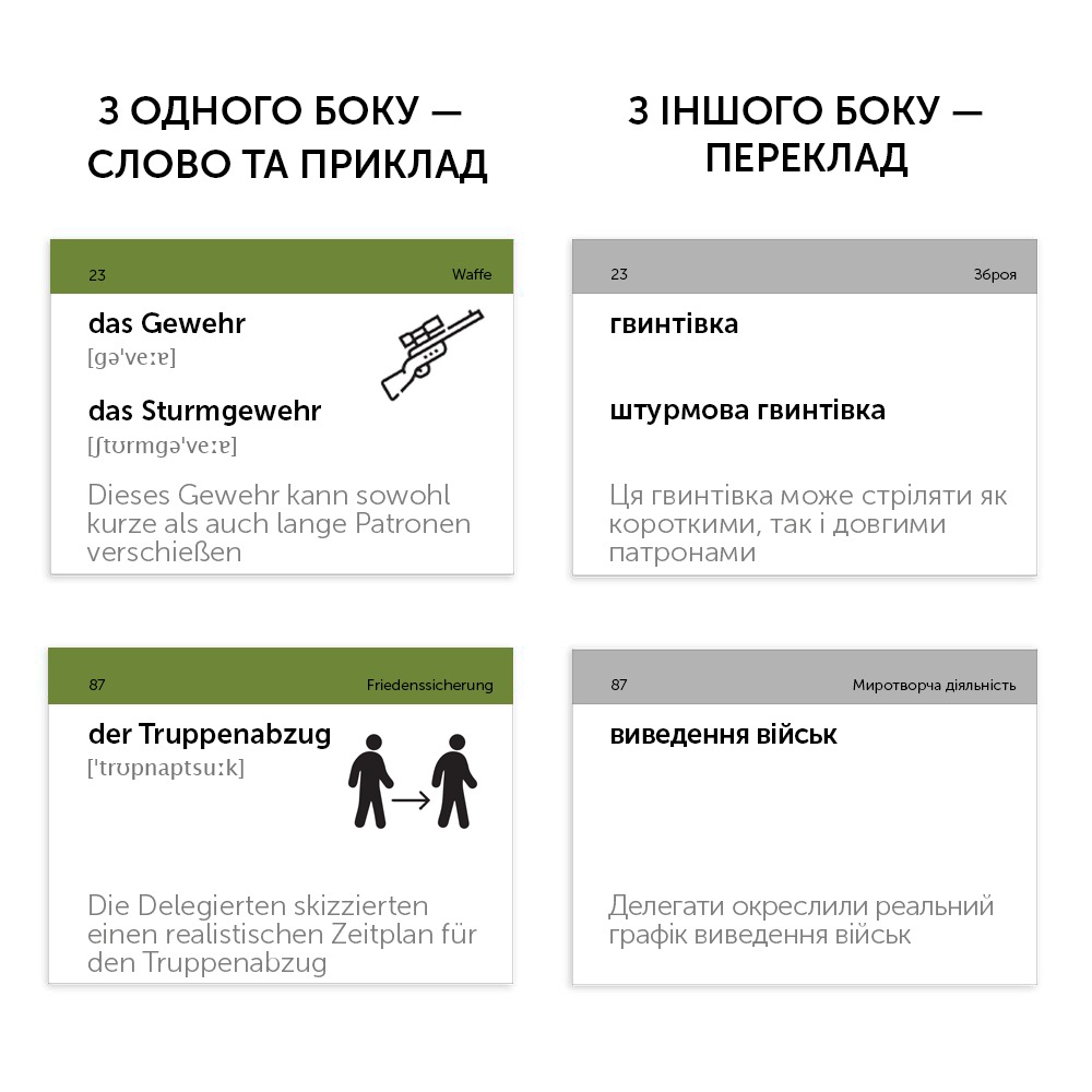 Картки «Militär Deutsch» (рівень А2-В2) — це німецька для військових. Набір із військовою лексикою підходить для курсантів, солдатів, офіцерів та всіх інших, які так чи інакше дотичні до армійської справи.