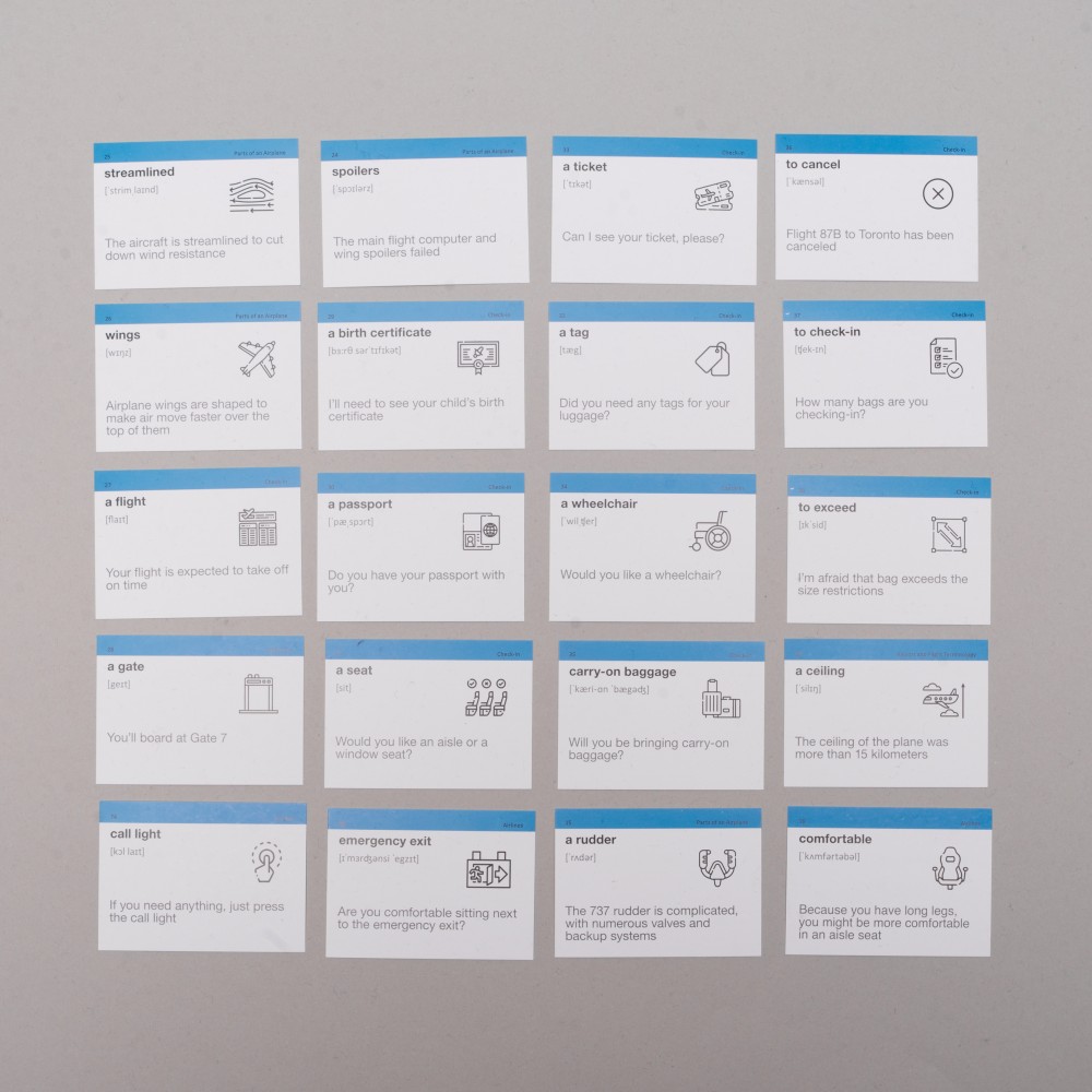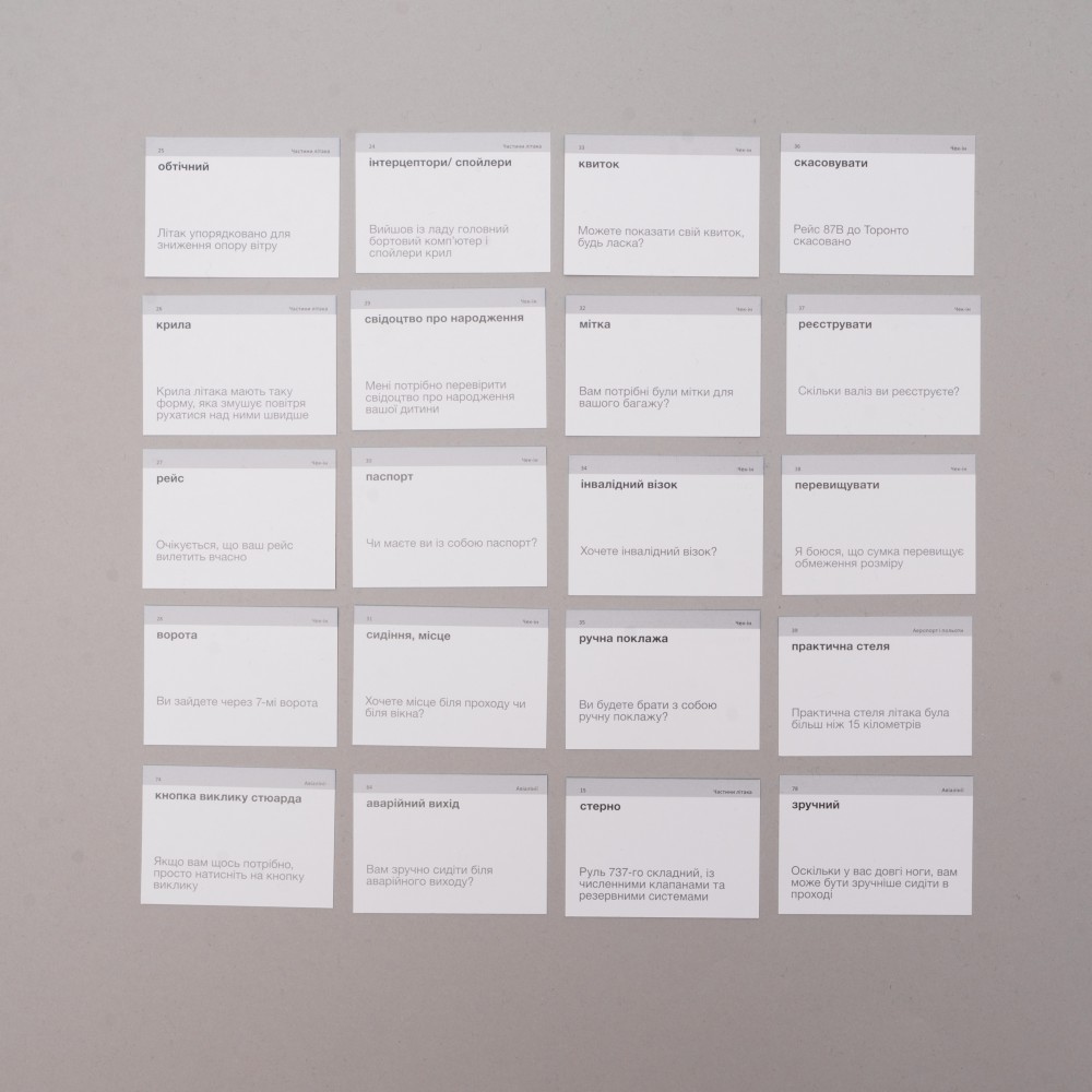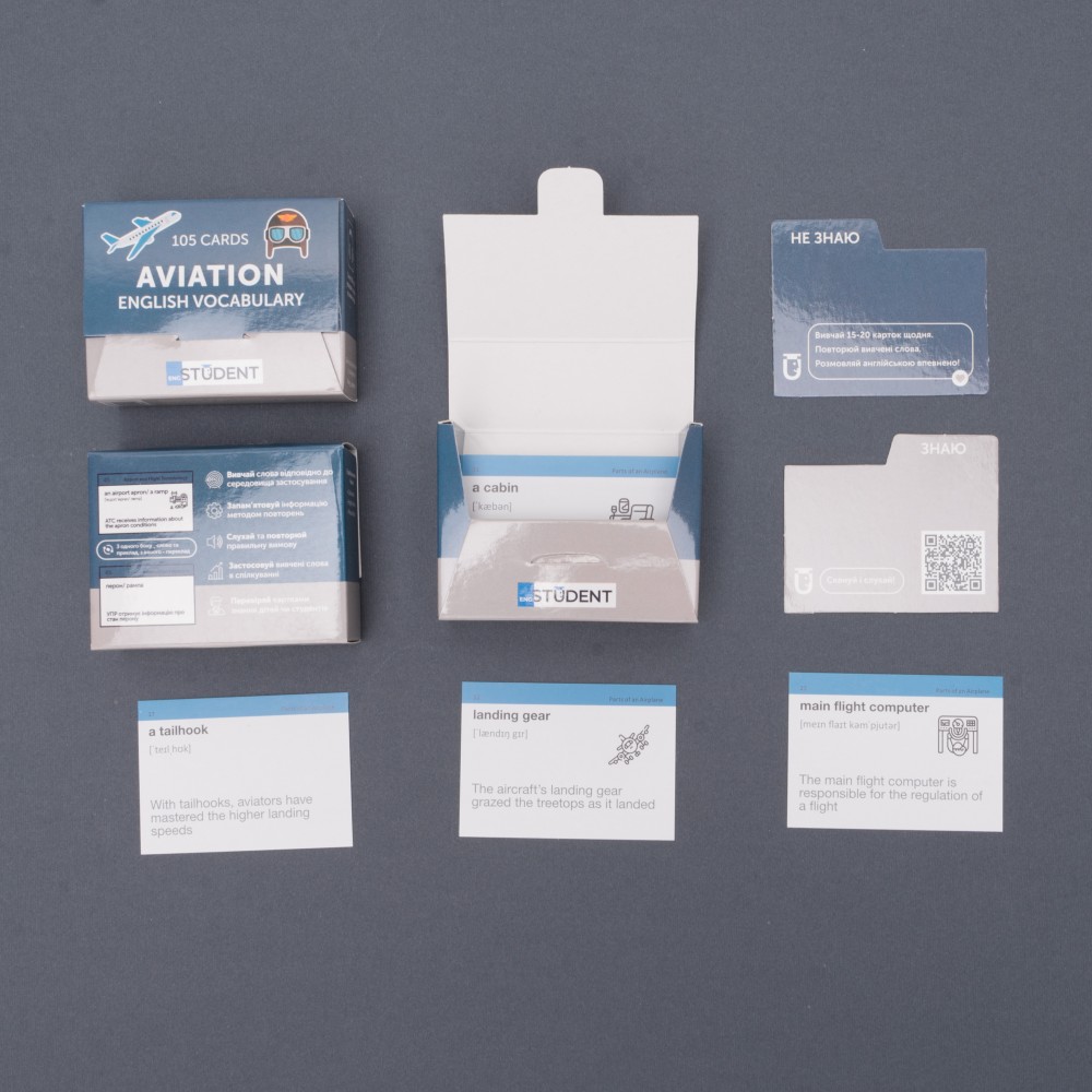 У наборі є 105 карток з особливими фразами та зворотами, значення яких відоме тільки авіаторам. Крім цього, картки з лексикою допоможуть пілотам підготуватися до спеціального мовного тесту, затвердженого Міжнародною організацією цивільної авіації (ICAO). А це — можливість рухатися далі, розвиватися і долітати до найвищих вершин!