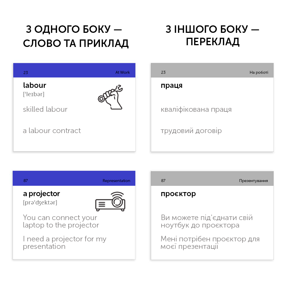 «Business English» — ділова англійська для роботи. Набір для тих, хто знає англійську на рівні В1-В2, але відчуває, що цього недостатньо, щоб спілкуватися з бізнес-партнерами. Вибирають ті, хто хоче впевнено вести переговори англійською про маркетинг, економіку чи торгівлю. 818 слів та 680 прикладів вживання.
