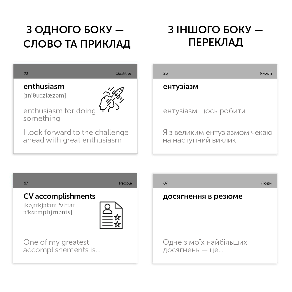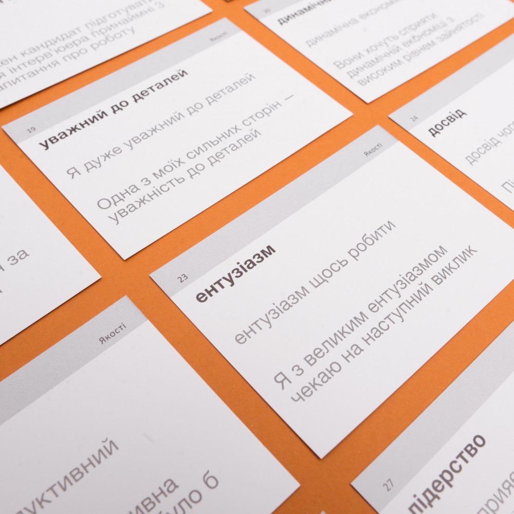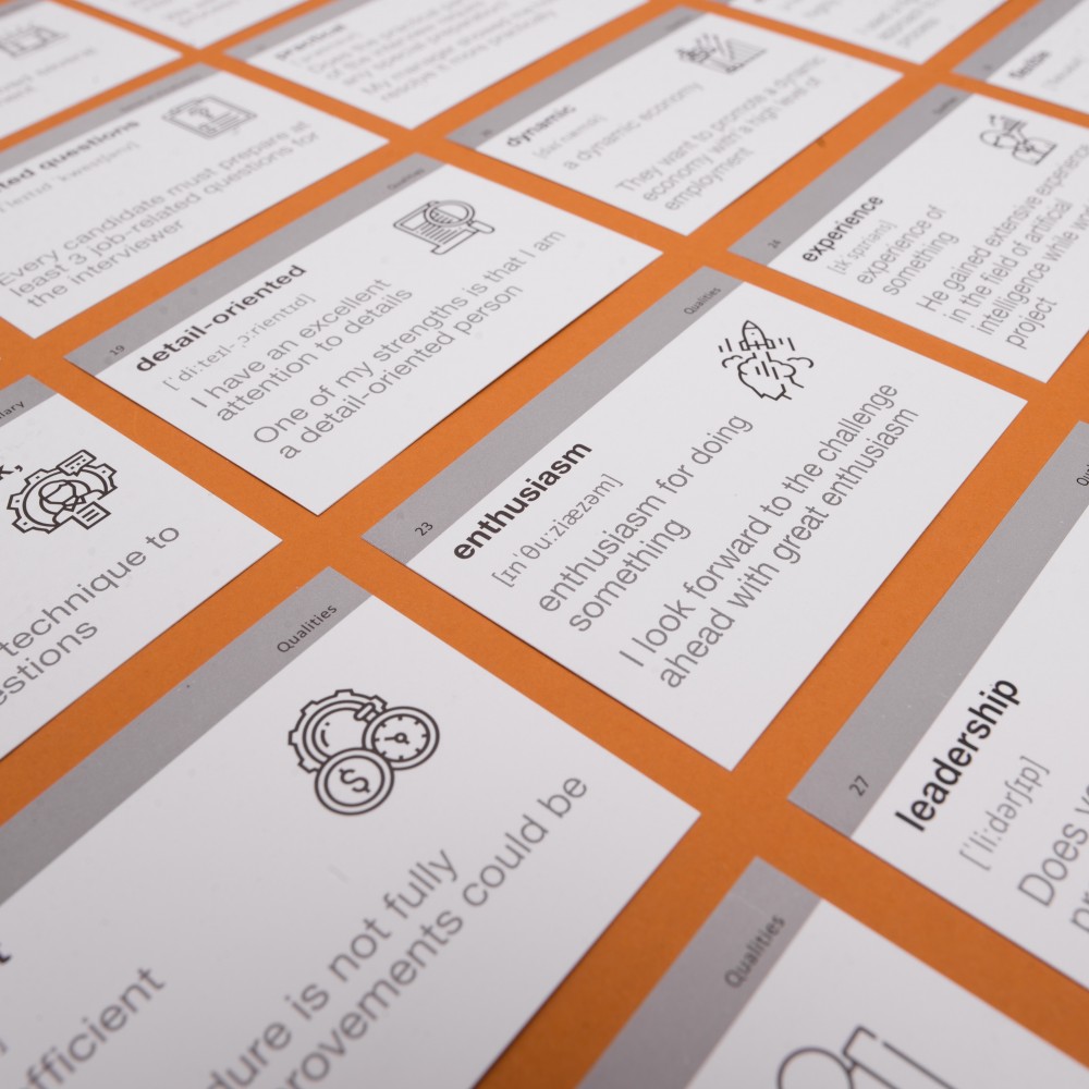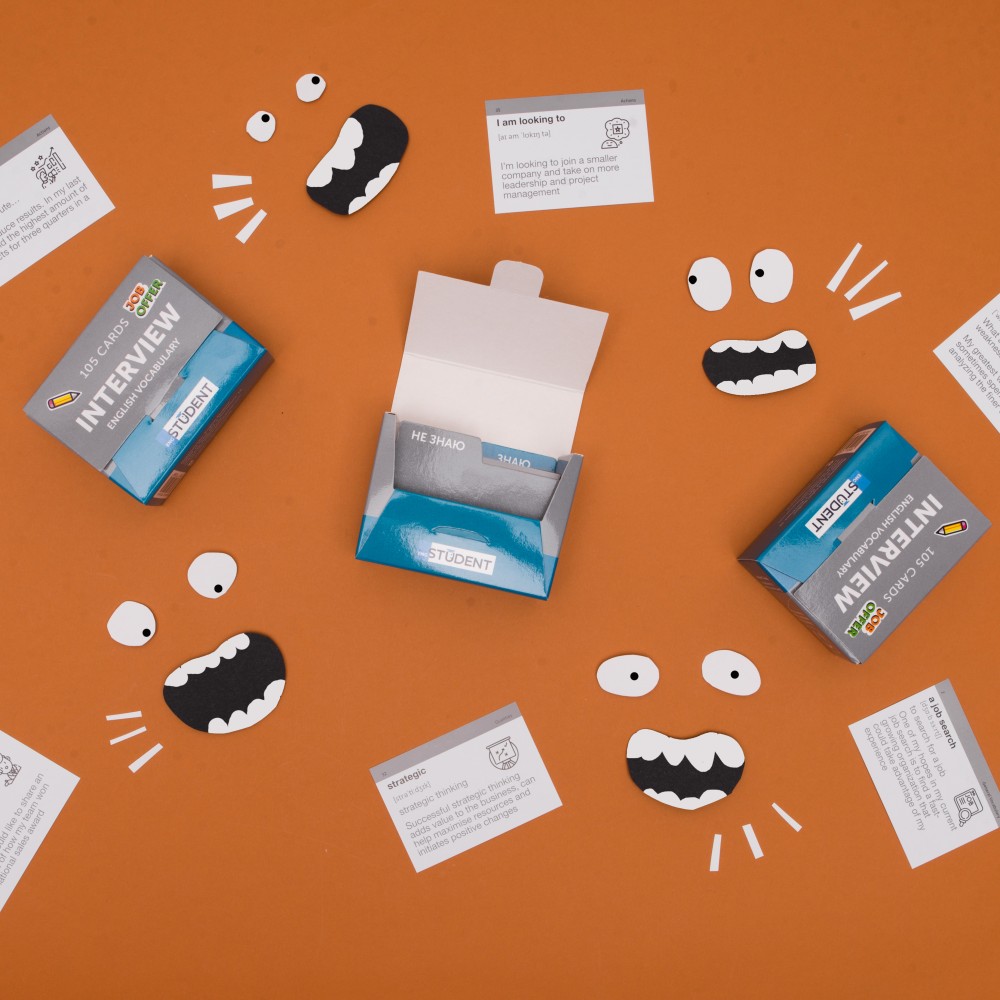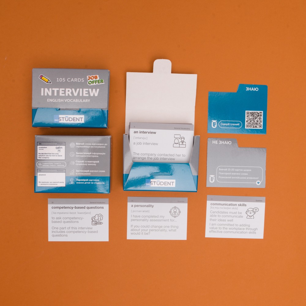 Співбесіда — часто бентежний та страшний етап приймання на роботу. Хвилювання та нервування затьмарюють мозок та збивають з пантелику. А особливо, якщо це співбесіда англійською.  Набір «Interview» (рівень А2-В1)  — це картки, які полегшать підготовку до інтерв'ю. У 105 картках ми зібрали найбільш потрібну лексику, яка знадобиться під час розмови. А додатковий аудіосупровід до кожного слова та виразу допоможе освоїти правильну вимову та справити враження досвідченого спеціаліста.