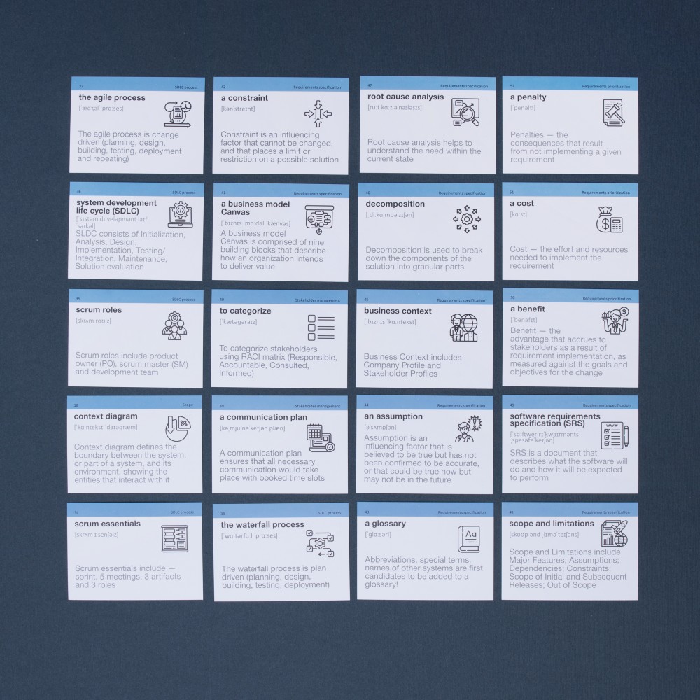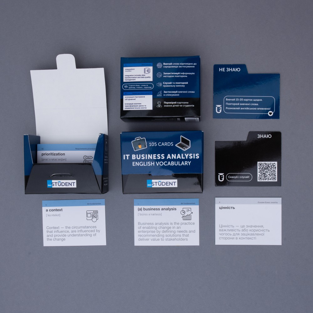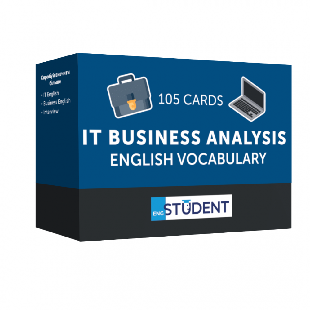 «IT Business Analysis» (рівень А2-В2) — картки з англійськими термінами та спеціальною лексикою для бізнес-аналітиків у галузі ІТ. Набір ідеально підійде тим, хто тільки починає свій шлях у цій професії та вже має певний рівень володіння англійською. Проте для аналітиків із досвідом він теж стане в пригоді! Адже професійний розвиток повинен бути постійно. Лексика набору складається зі специфічних термінів, назв процесів та інших корисних слів та фраз.