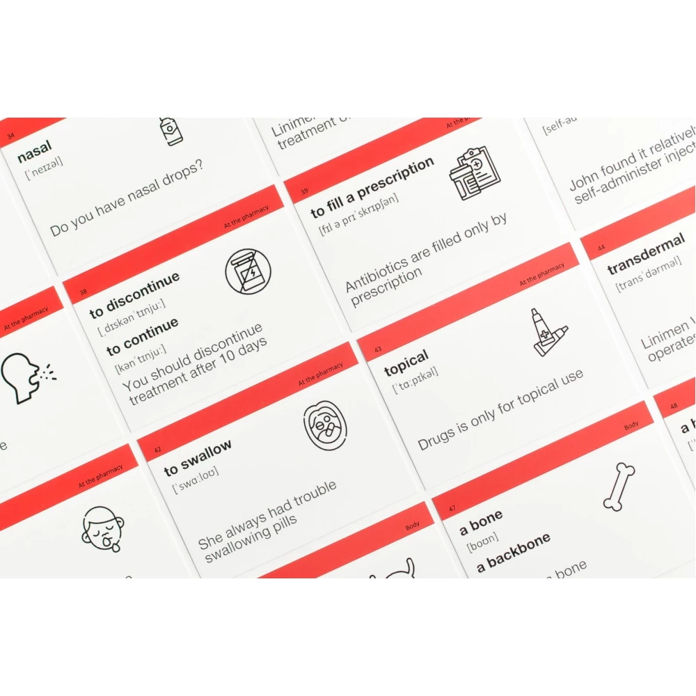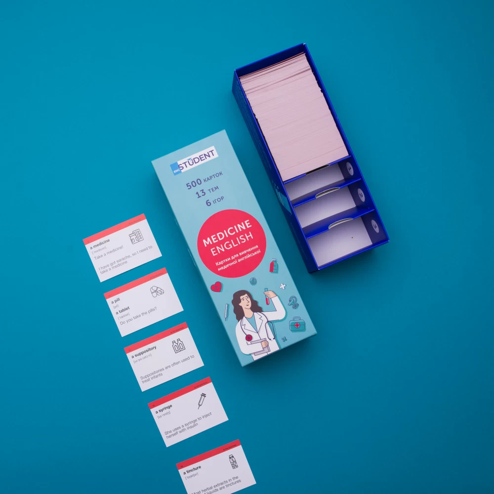 «Medical English» (рівень В1-С1) — картки англійських слів для медиків. Вибирають ті, хто хоче навчатись чи стажуватись за кордоном у сфері медицини та вільно спілкуватись на професійні теми. У цьому наборі 794 англійських слова та 491 приклад їх вживання.
