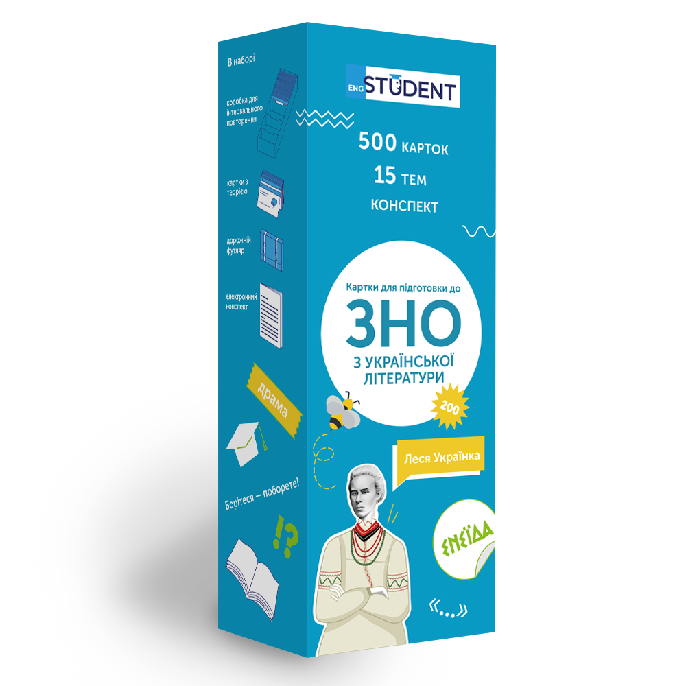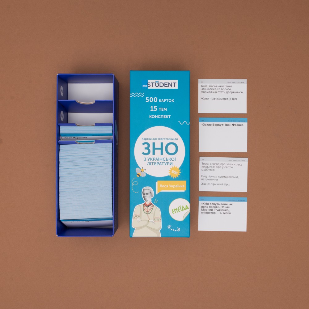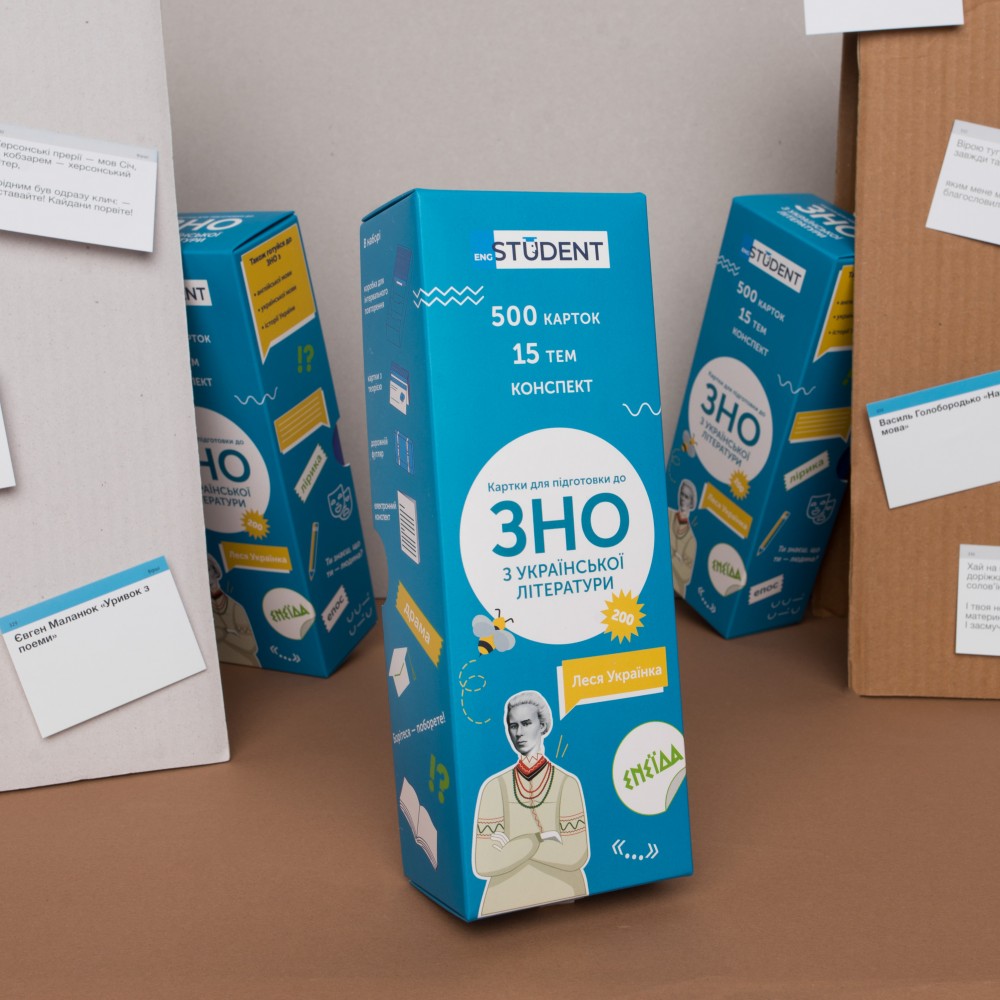 «ЗНО. Українська література» — набір для підготовки до тестування ЗНО, створений відповідно до програми, рекомендованої МОН України. Найважливіша інформація з курсу української літератури вміщена на картках. Набір допоможе запам'ятати час та місце розвитку подій у творах, псевдоніми письменників, особливості стилів літератури та інше. Додатковим бонусом до карток є е-конспект, у якому детальніше розкриті теми, винесені на ЗНО, розписані цитатні характеристики героїв, біографії авторів та викладені паспорти творів.