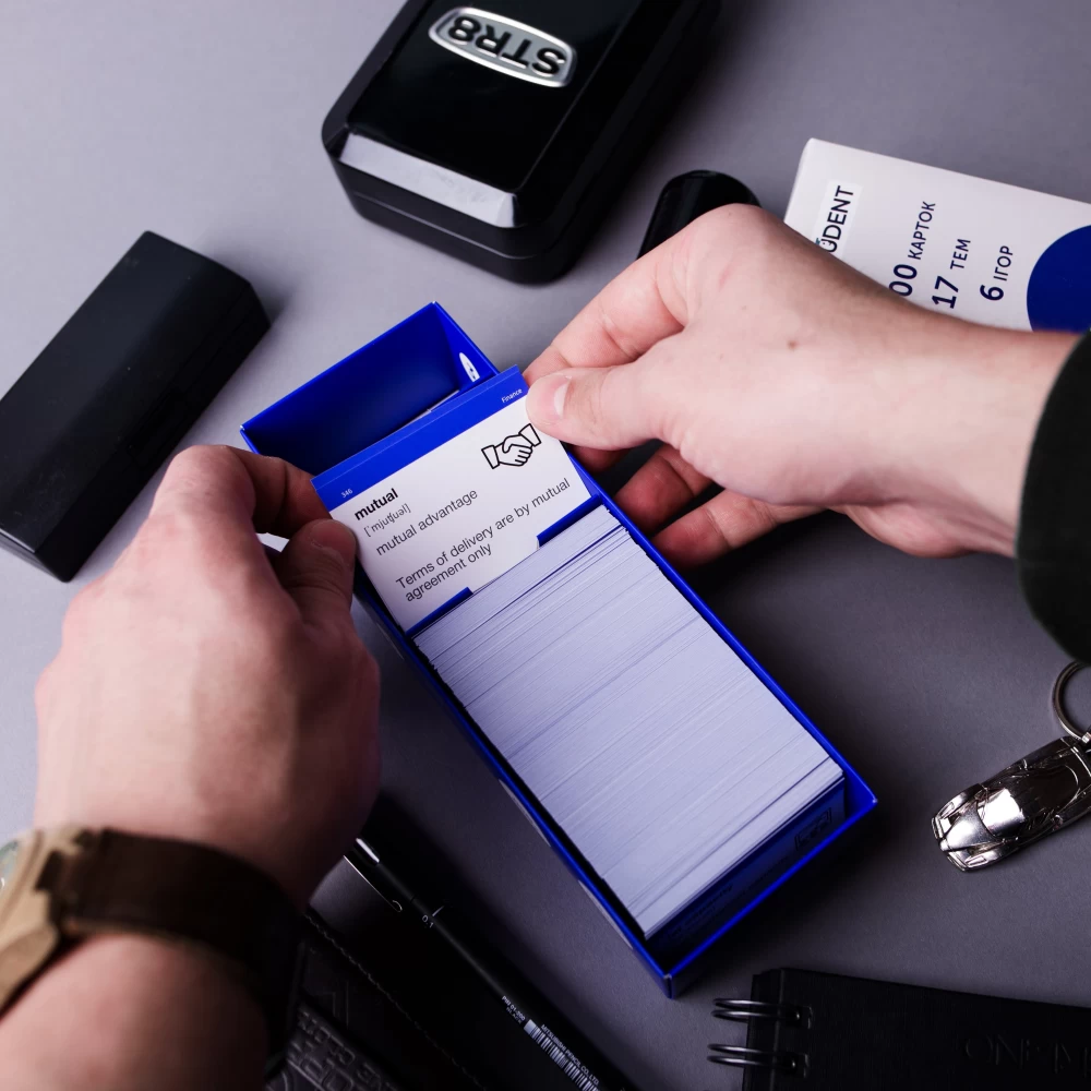 Кожен набір містить: 500 карток, коробку для інтервального повторення, дорожній футляр, QR-код з аудіосупроводом та збірку ігор.