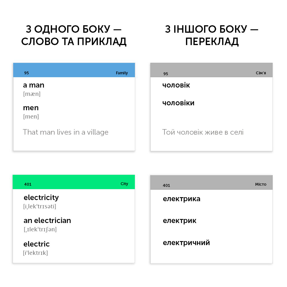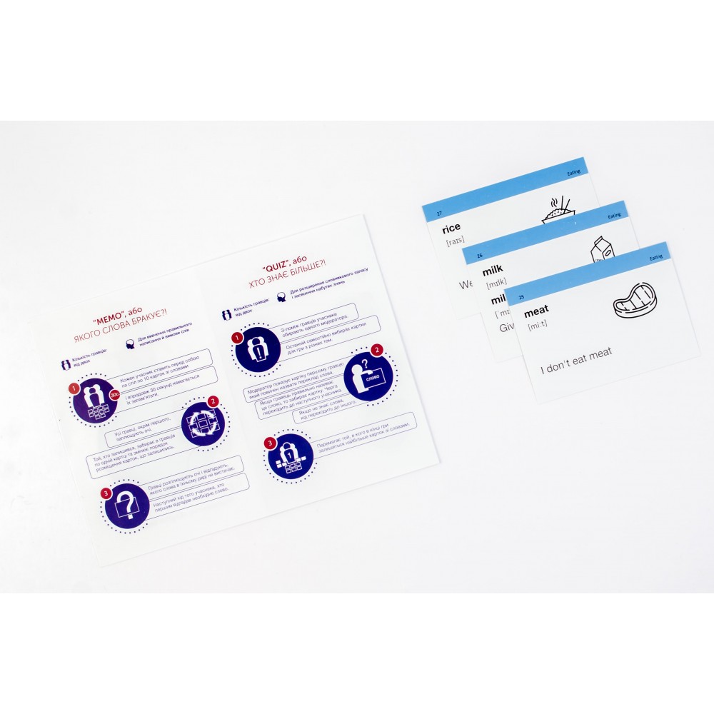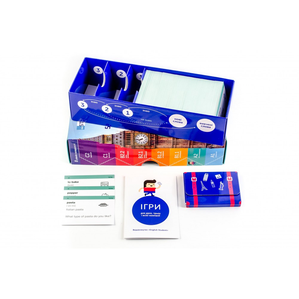 Кожен набір містить: 500 карток, коробку для інтервального повторення, дорожній футляр, QR-код з аудіосупроводо та збірку ігор.
