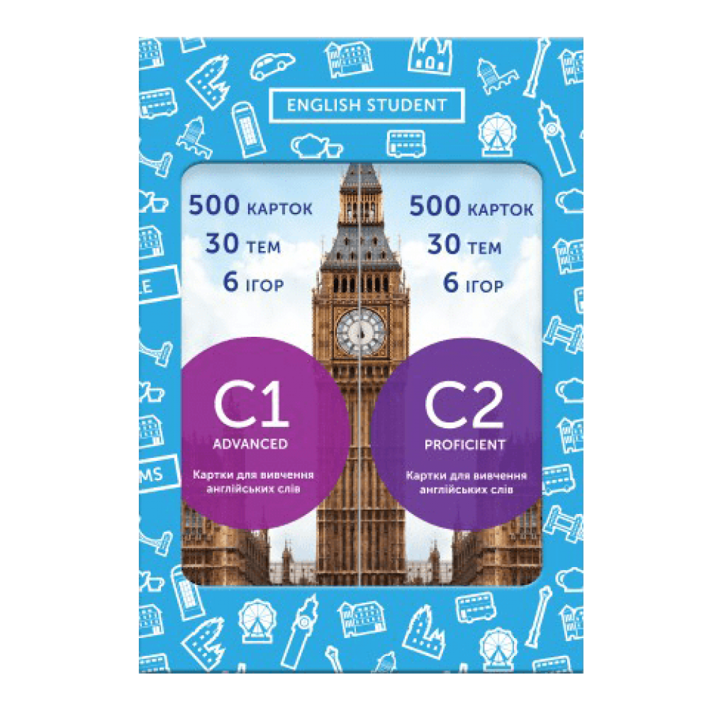 Кожен набір містить: 500 карток, коробку для інтервального повторення, дорожній футляр, QR-код з аудіосупроводом та збірку ігор.