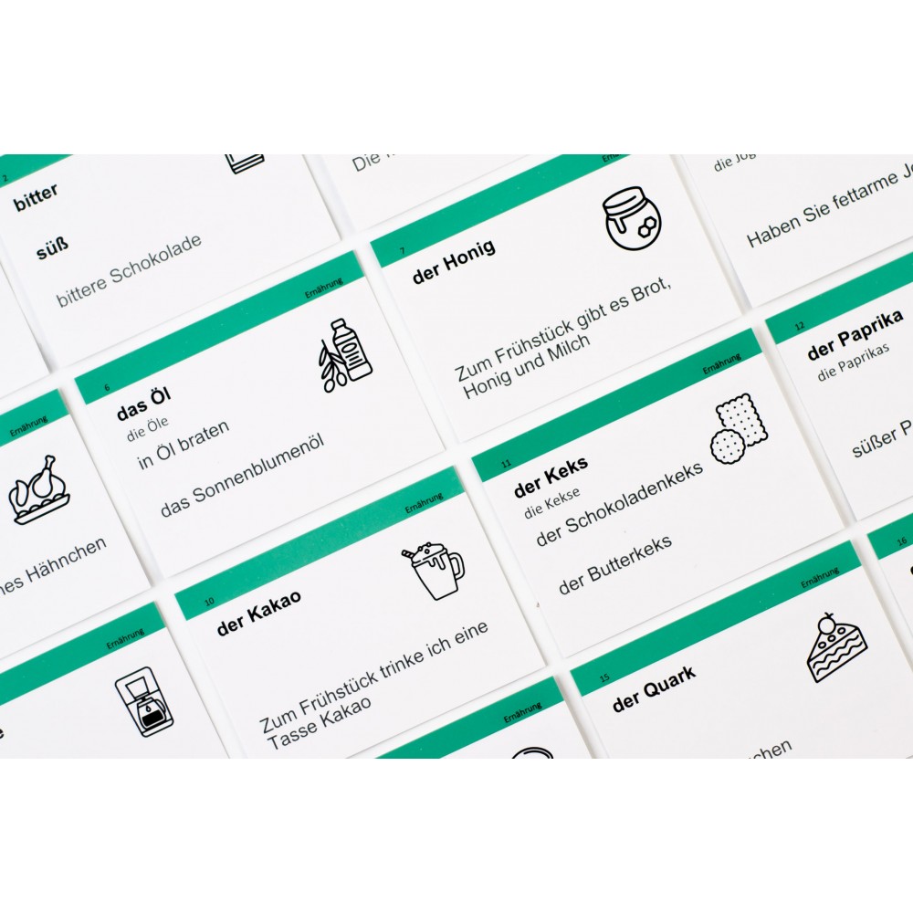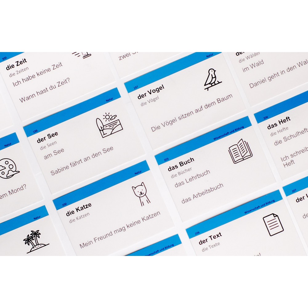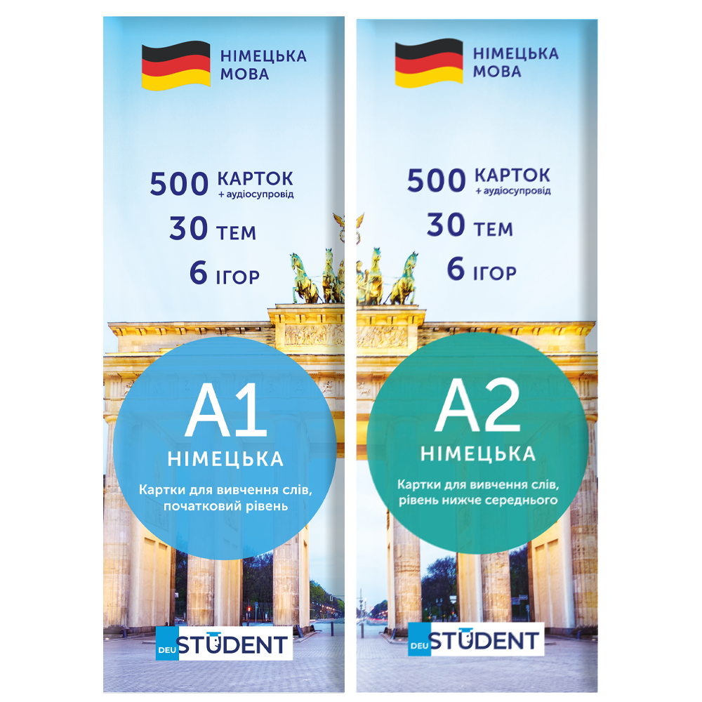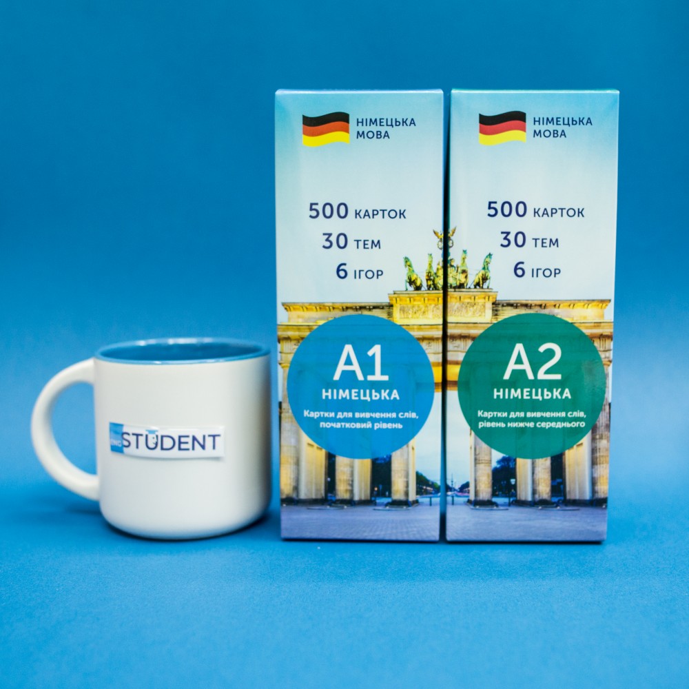 Набір «Німецький старт» — картки німецьких слів для початківців. Обирають ті, хто розпочинає вивчати німецьку або хоче швидко освіжити шкільні знання, щоб рухатись до вищих рівнів. Наприкінці вивчення рівнів А1 та А2 ти зможеш розповідати про себе німецькою, читати оголошення та навіть писати особисті листи по-німецьки. Кількість німецьких слів у двох рівнях — 1286, прикладів вживання — 1200.