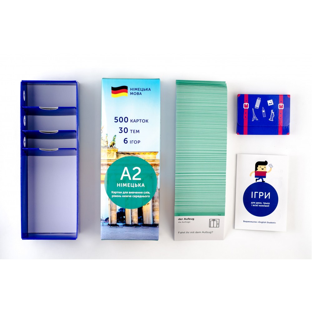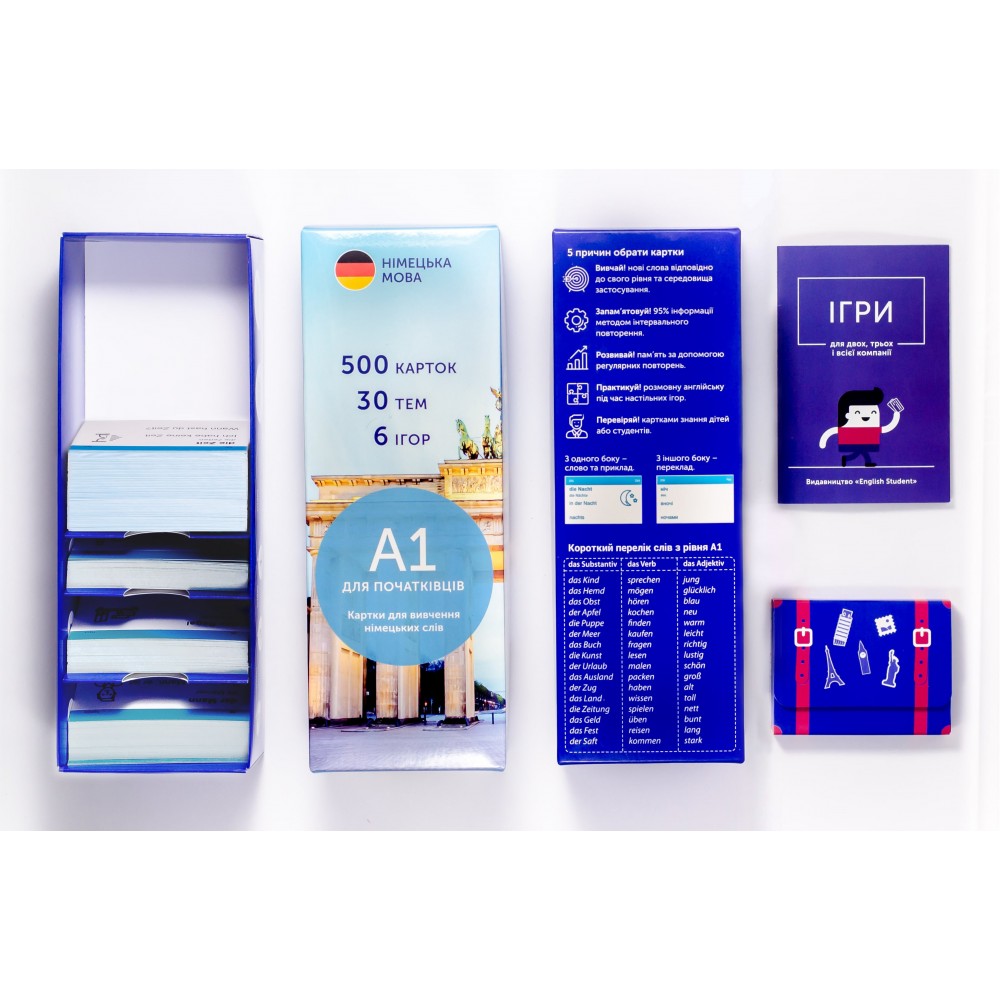 Кожен набір містить: 500 карток, коробку для інтервального повторення, дорожній футляр, QR-код з аудіосупроводом та збірку ігор.