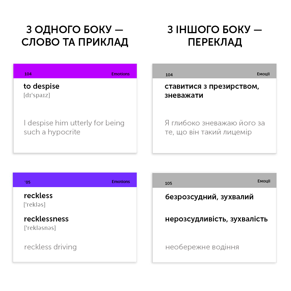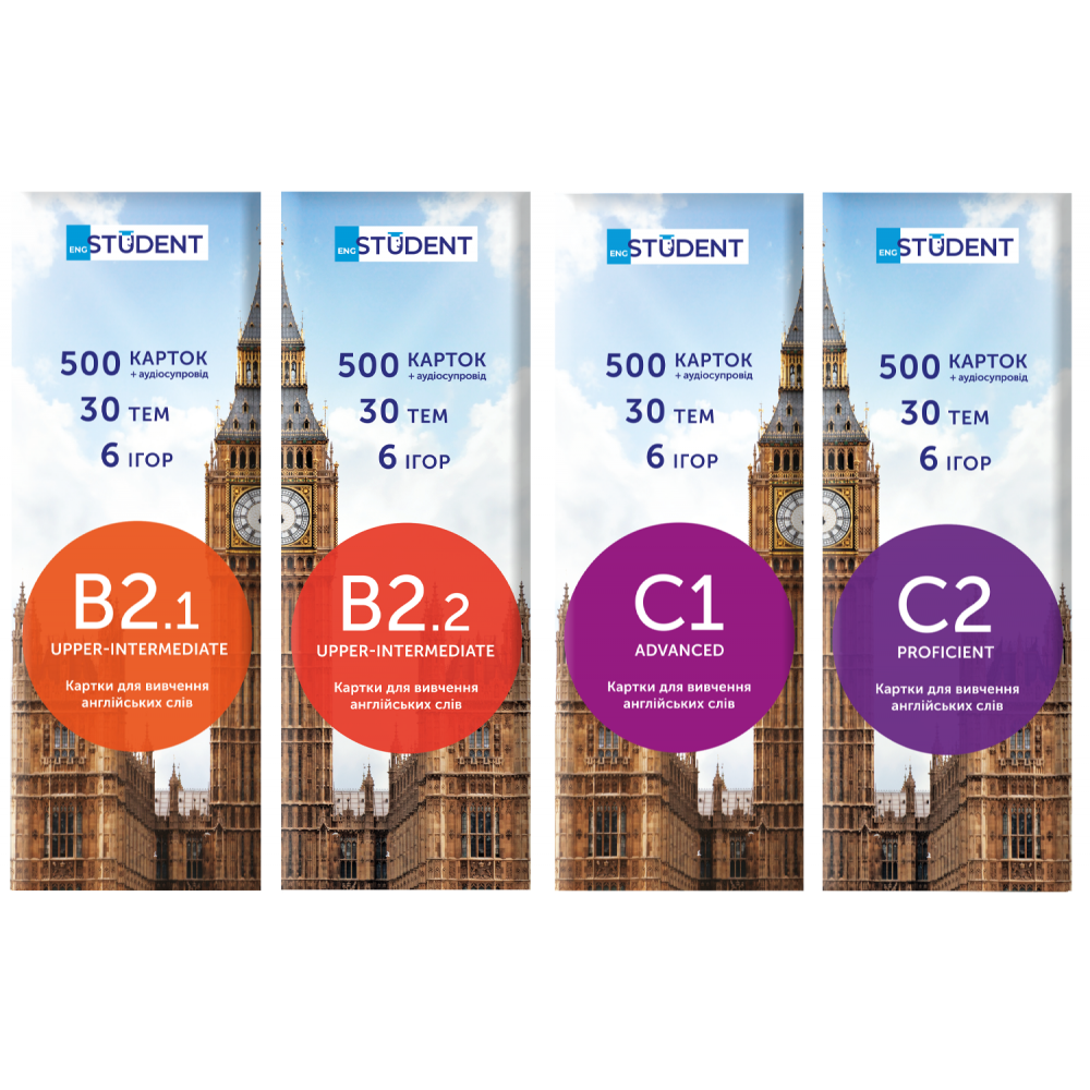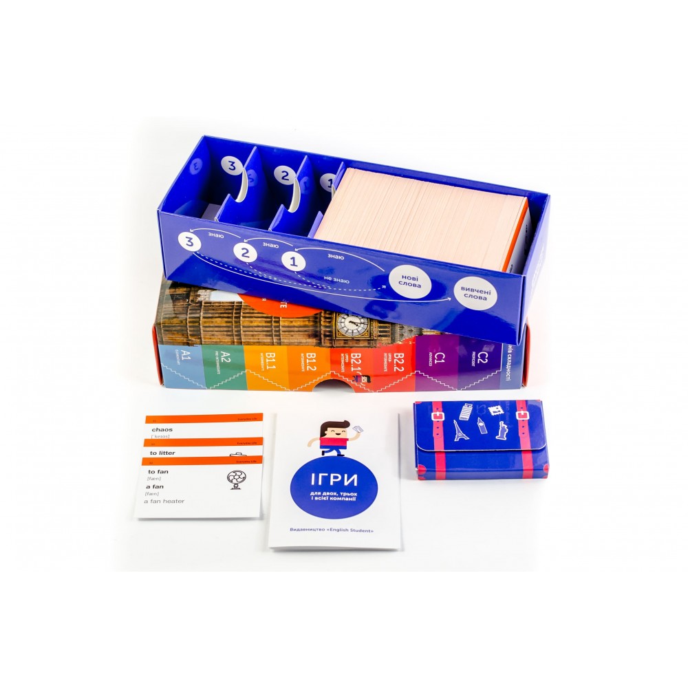 Кожен набір містить: 500 карток, коробку для інтервального повторення, дорожній футляр, QR-код з аудіосупроводом та збірку ігор.